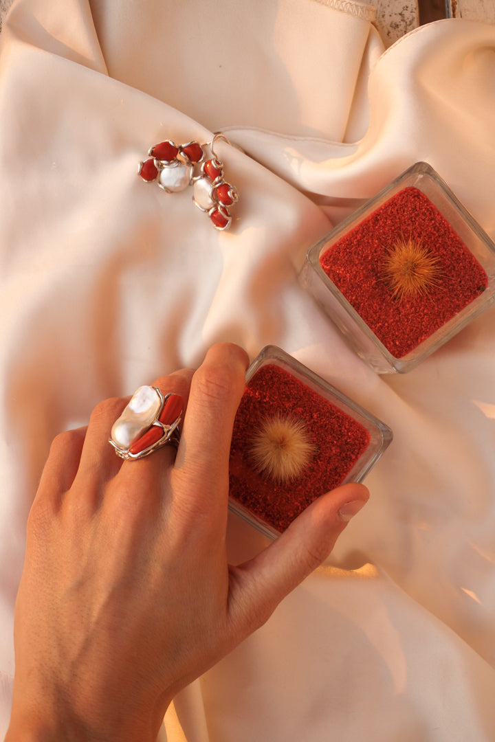 Anello in argento925 con corallo e perla scaramazza incastonati.
